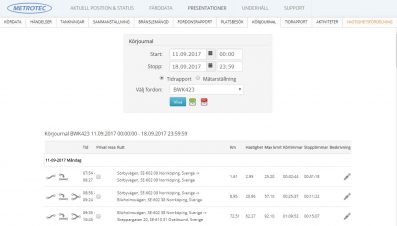 Det interaktiva användargränssnittet möjliggör att hålla körjournal, bl a baserat på vägmätaren. Användaren kan efter behov välja lämpligt exportformat för varje rapport, vare sig html, pdf, csv eller xls.
