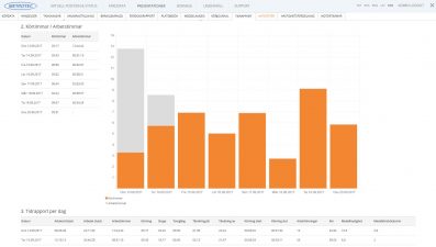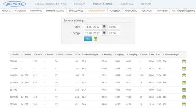 Rapporterna visar kör-, stillestånds- och väntetider, arbets- och vilotider samt körhastigheter. Även körsträckor, tankningar, genomsnittlig bränsleförbrukning per 100 km och motortimmar.