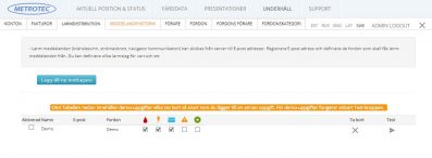 Dessutom är det viktigt att få påminnelser om s k rutinmässiga skyldigheter såsom besiktning, försäkring eller tekniskt underhåll. Larmsystemet delar in dessa händelser i olika kategorier och möjliggör att meddela de behöriga personerna om dessa. Du kan ange ett obegränsat antal mottagare och koppla dem till olika lastbilar.