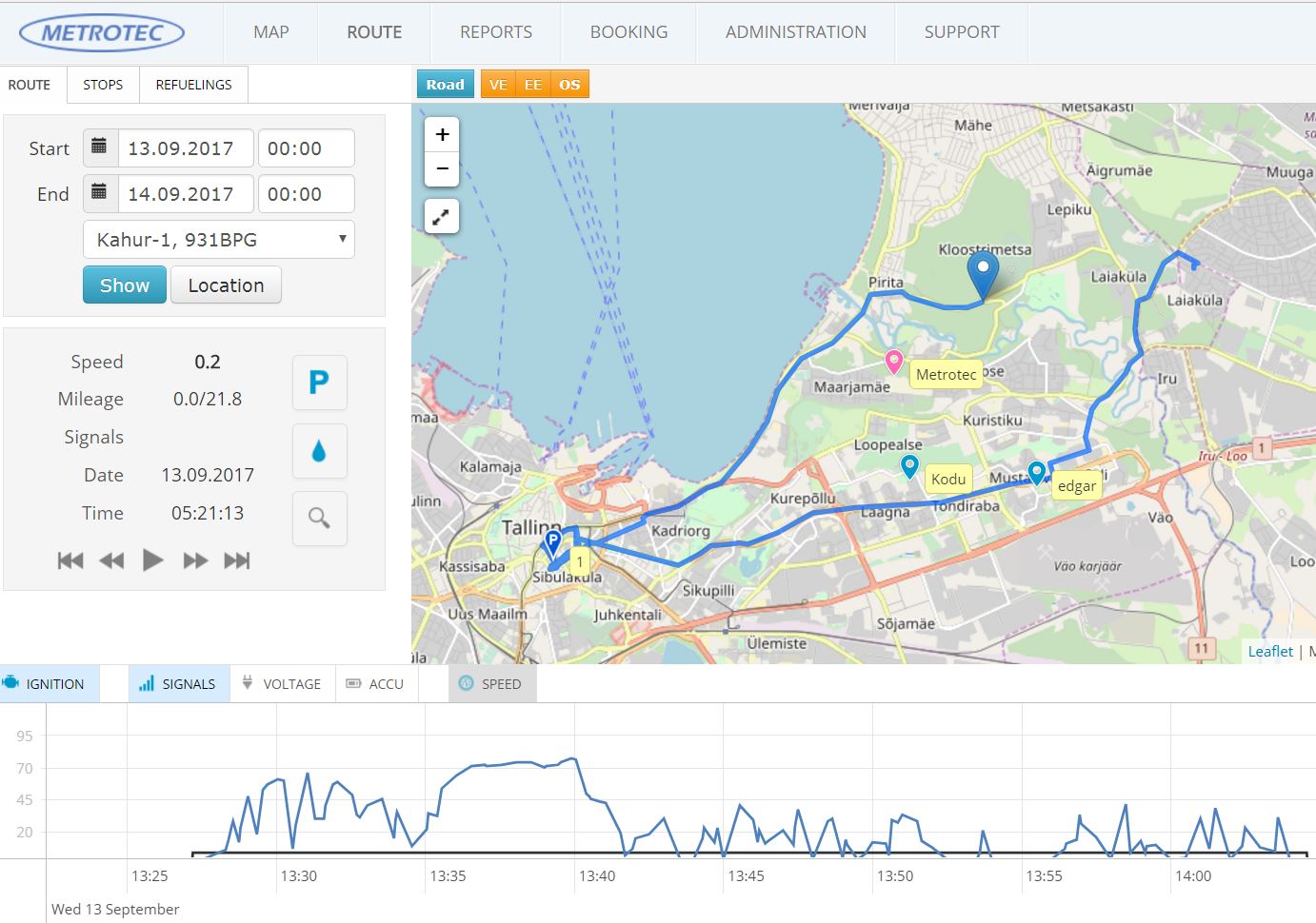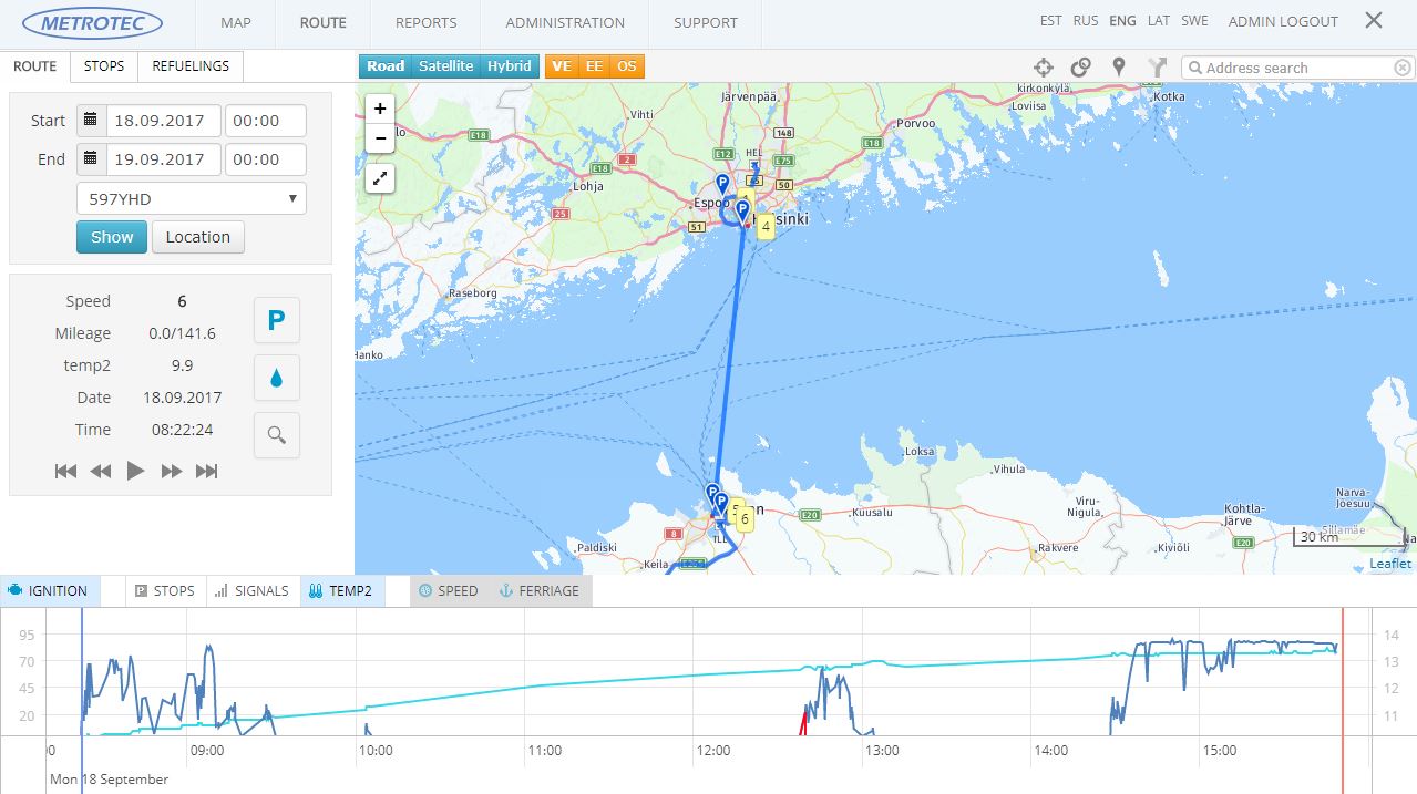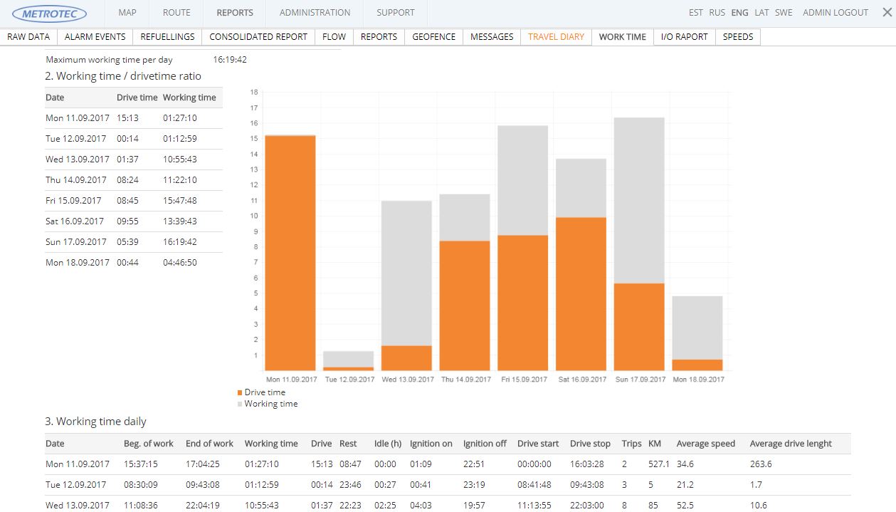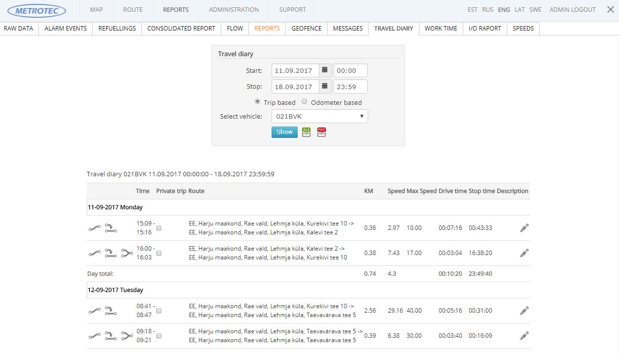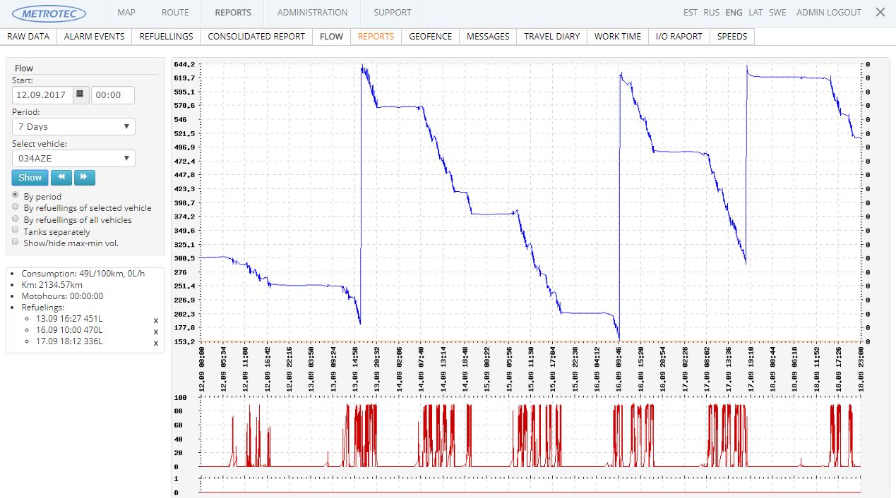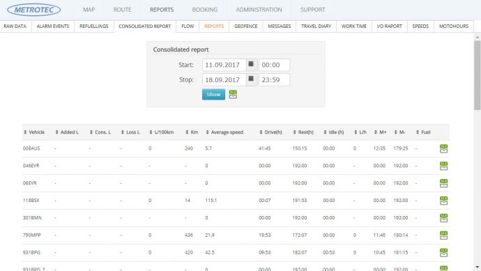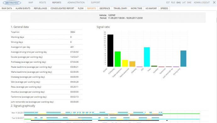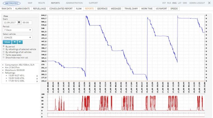 F-Track system produces continuous high quality data stream by registring periodically readings from connected sensors, detecting changes in the readings and storing 24/7 movement history. Processing, filtering and concentrating this data provides users with different reports. The reports reflect driving, waiting and idle periods, work and rest time and movement speed as well as mileage, refueling, average fuel consumption per mileage and working hour. Interactive user interface enables odometer based task diary. User may export reports as needed in html, pdf, csv or xls formats.