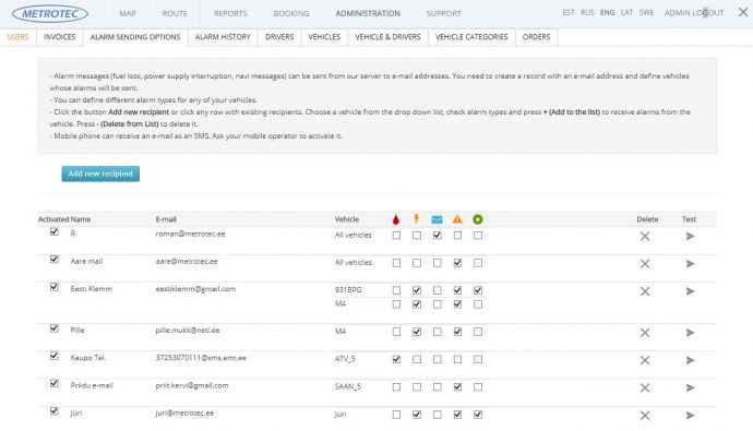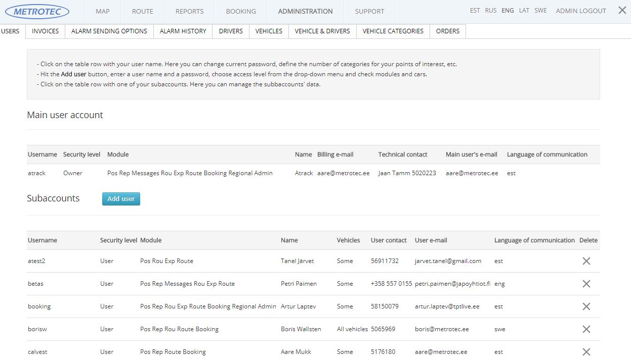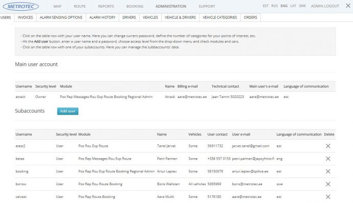 By creating and administering user accounts you can provide workers, business parners, clients, etc. with different levels of access to the data of F-Track system. Somebody wants a certain report about certain vehicle. Somebody wants to track a cargo. Somebody wants to see exact hours they were billed for. Flexible system of sub-accounts with different profiles and privileges combined with tying different users to different vehicles allows for taylor made customisation of access to data.