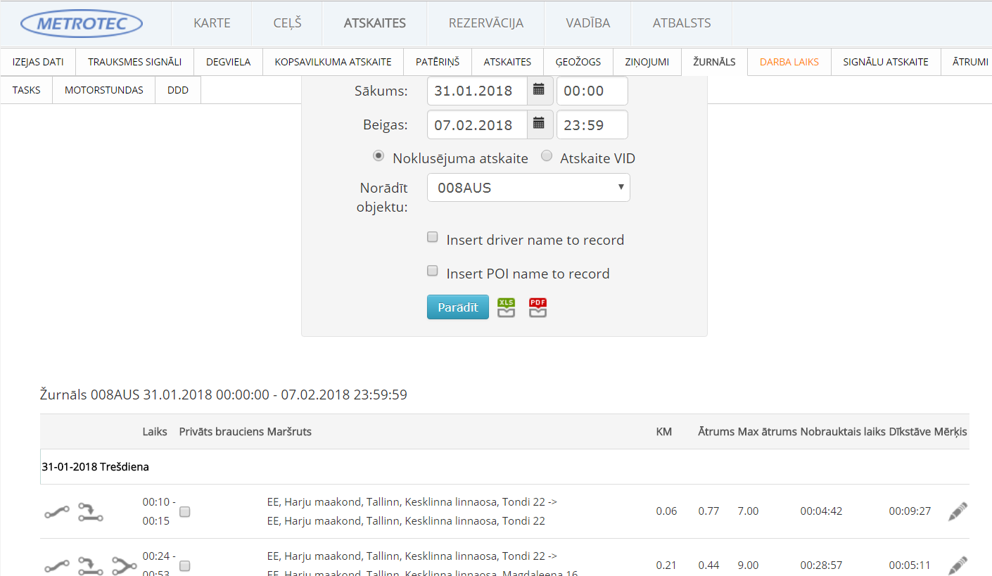 Interaktīva lietotāja saskarne ļauj veidot transportlīdzekļa lietošanas žurnālu, arī uz odometra pamata. Atbilstoši vajadzībām, lietotājs var katrai atskaitei izveidot piemērotu izvades formātu, html, pdf, csv vai xls.