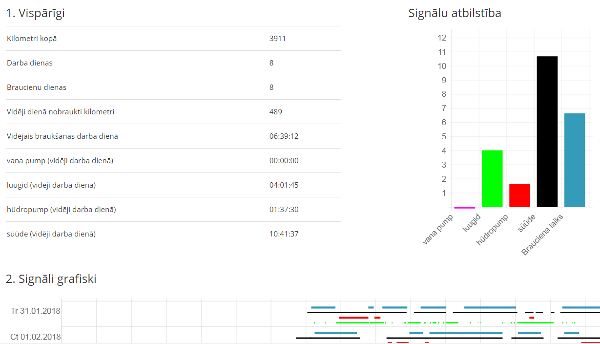 Atskaites ataino braukšanas, stāvēšanas un brīvo laiku, darba un atpūtas laiku, kustības ātrumus. Arī nobraukumus, degvielas uzpildes, vidējo degvielas patēriņu uz 100 km un uz motorstundu.