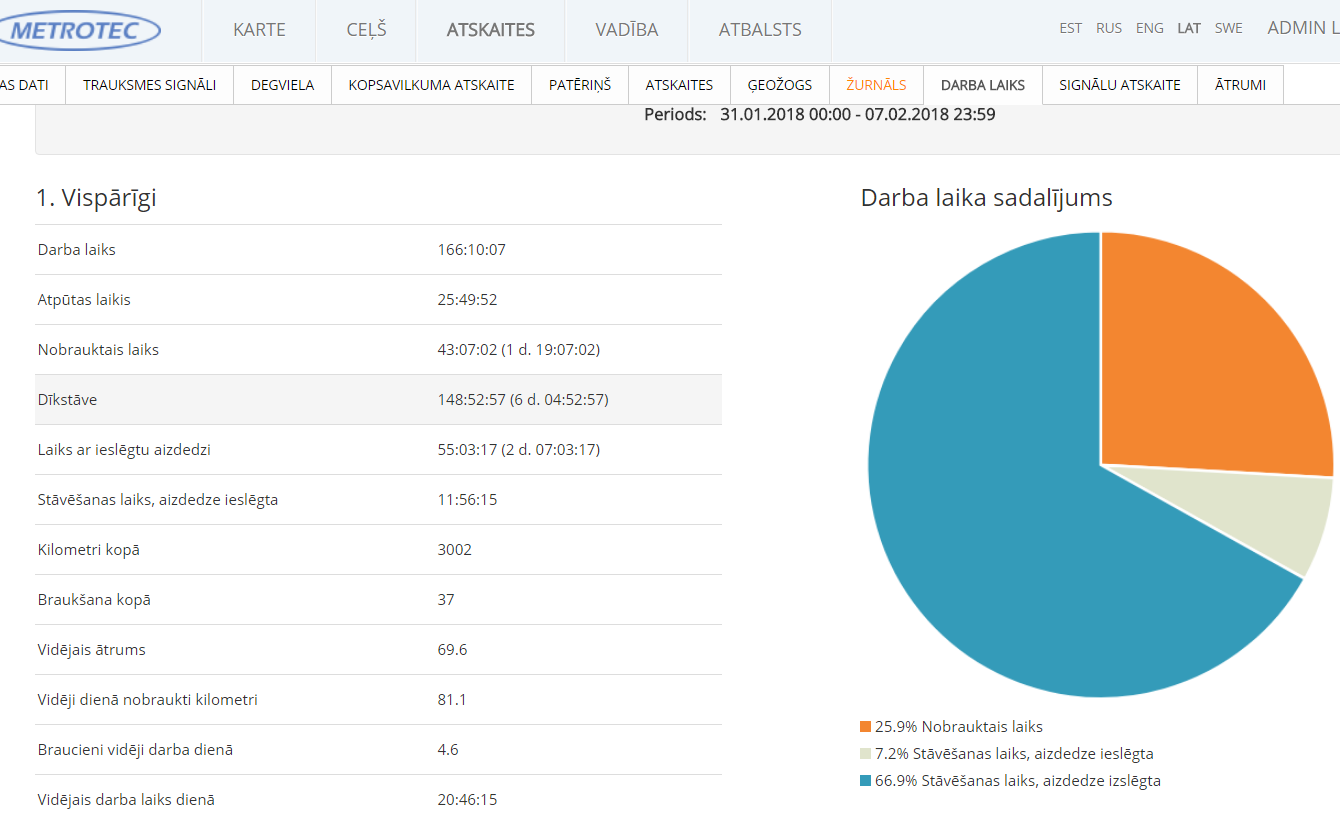 - Detalizētas atskaites par vadītāja darbību, pārkāpumiem un kļūdām