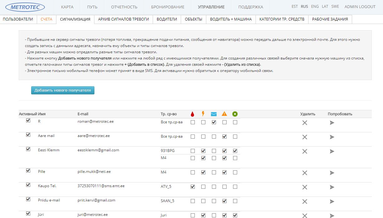 Очень важно быть вовремя уведомлённым о возникшей проблеме. Наиболее приемлемым видом оповещения в случае потери топлива считается SMS. Во многих случаях именно благодаря оперативному реаагированию виновника удавалось задержать еще на месте. Так же важно получать оповещения о плановых технических обслуживаниях, предстоящих техосмотрах или истекающем сроке действия страховки. Услуга оповещения разделяет разные события по категориям и информирует непосредственно связанных с событием людей. Можно создать неограниченное количество адресатов и связать их с разными машинами. Назначая адресатам типы сообщений можно быть уверенным, что нужные люди вовремя получат необходимую информацию по электронной почте или в виде SMS-сообщения, будь то сигнал тревоги, потеря топлива или важное сообщение от водителя.