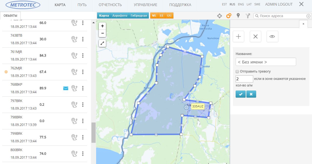 Зонами в форме круга или многоугольника на карте можно отметить места загрузки и разгрузки, месторождения полезных ископаемых, земельные участки или любые другие территории. Отчёт опосещениях зон позволяет удобно подсчитывать автогрузы, а такж измерять время, затраченное на очистку снега, подготовку земельного участка к севу или оказание других услуг. Пользователь может заказать услугу оповещения на случай, если в зоне собирается количество машин, превышающее дозволенное.