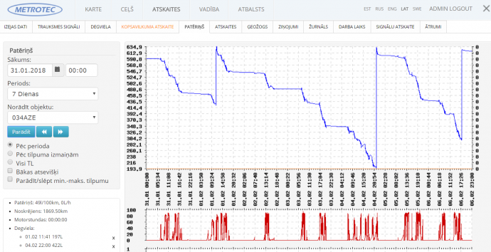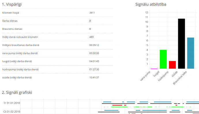 Atskaites ataino braukšanas, stāvēšanas un brīvo laiku, darba un atpūtas laiku, kustības ātrumus. Arī nobraukumus, degvielas uzpildes, vidējo degvielas patēriņu uz 100 km un uz motorstundu.