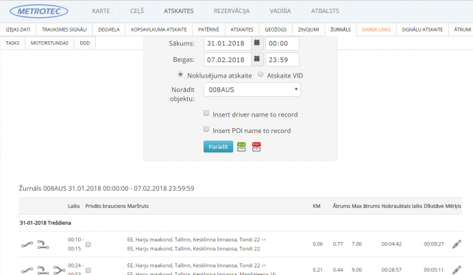 Interaktīva lietotāja saskarne ļauj veidot transportlīdzekļa lietošanas žurnālu, arī uz odometra pamata. Atbilstoši vajadzībām, lietotājs var katrai atskaitei izveidot piemērotu izvades formātu, html, pdf, csv vai xls.